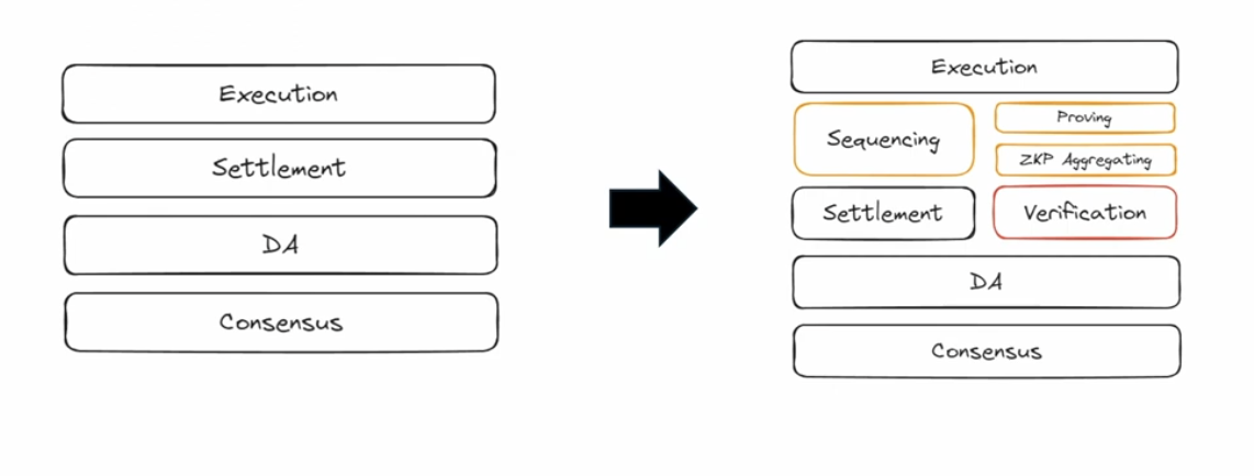 모듈러 블록체인 자체가 아직 개념조차 형성된 지 얼마 되지 않은 상태이다. 모듈형 블록체인이 처음 제안되었을 때에는 기본적인 합의, 연산, 세틀먼트, DA로 나뉘었지만 최근에는 더욱 다양하게 모듈형 스택이 나뉘고 발전되고 있다.